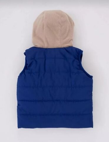 5 yaş- Marka: Orchestra (etiketdə görünür) - Rənglər: tünd göy əsas, ön və arxa hissədə yaşıl zolaq, krem rəngli incə zolaqlar - Model: qolsuz, fermuarlı - Material: yüngül və isti şişmə qat, triko...