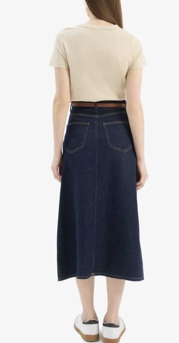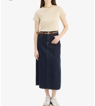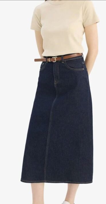 31-razmer ikisi bir yerdə 25m Mavi rəngli denim ətək. - Material: klassik qalın cins parça - Dizayn: düz kəsim, dizdən aşağı uzunluq - Ön hissədə distress/çatlar və cırıq effektləri ilə dekor - Kə...