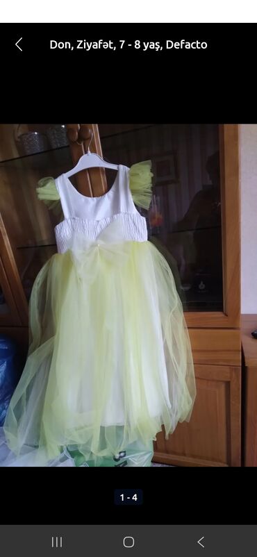 7-8 yaşlı qızlar üçün nəzərdə tutulmuş, Defacto markasına aid sarı rəngli ziyafət donu. Donun ağ rəngli, qısaqol, krujeva naxışlı üst hissəsi və sarı rəngli, çoxqatlı tül ətəyi var. Bel hissəsində kiçik sarı bant detalları donu daha da gözəl göstərir. Yüngül materialı sayəsində rahatlıq təmin edir. Qız uşaqları üçün əla seçimdir.