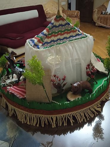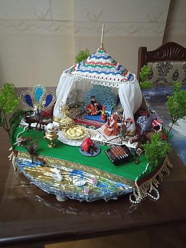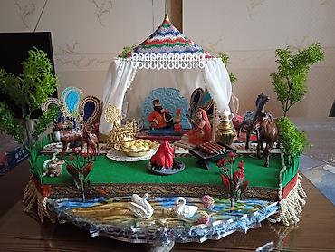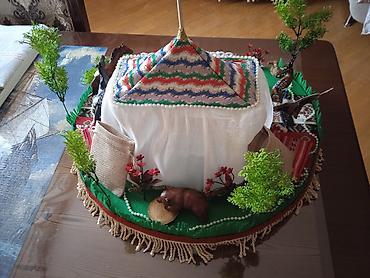 - Əl işidir, detallı milli kompozisiya: üstü naxışlı çadırtipli yurd, içəridə oturacaq, xalça və bəzək elementləri.