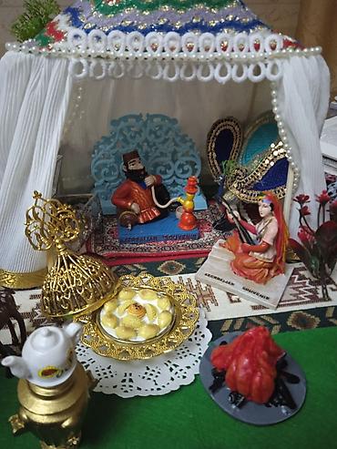 - Səhnə ətrafında miniatür fiqurlar: qonaqlar, musiqi alətləri, samovar, mis qablar, şirniyyat sinisi, manqal-kabab, ocaq, heyvan fiqurları (at, maral və s.).