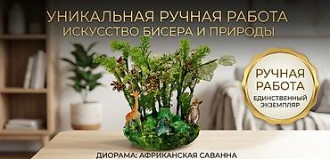 Qeyd: Vizualda “Ručnaya rabota” (əl işi), “Yeganə nüsxə” və “Eksklüziv dizayn” vurğulanır. Diorama adları: “Afrikanskaya savanna” və “Çudesnıy prud”.