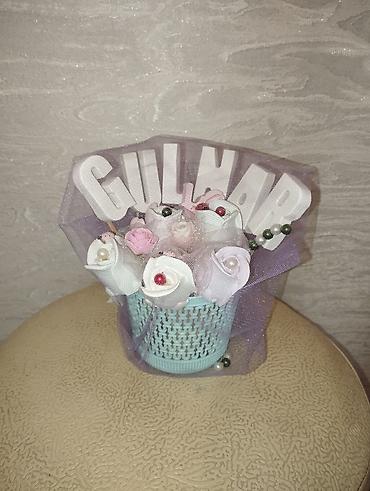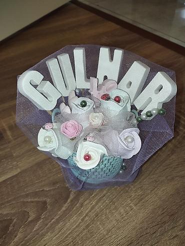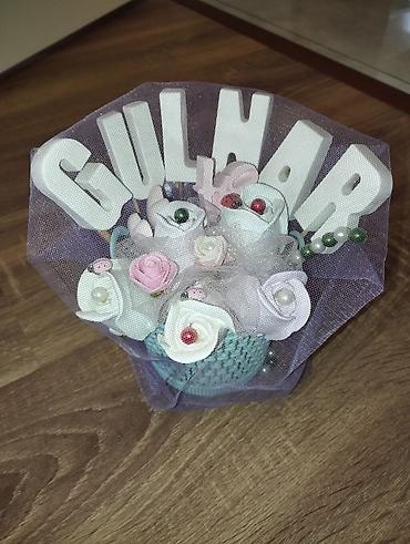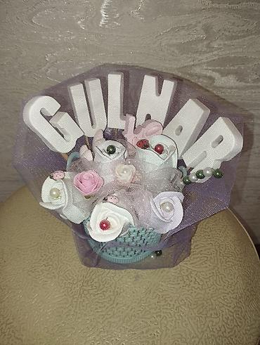 Məhsul: əl işləri dekorativ buket və kompozisiyalar - Atlas lentdən hazırlanmış gül buketləri: müxtəlif rəng kombinlərində (bənövşəyi-sarı, çəhrayı, qızılı və s.), müasir bükmə kağızı və parlaq le...