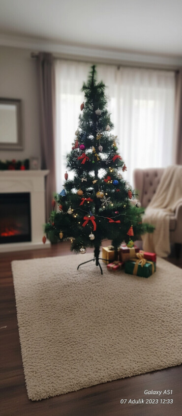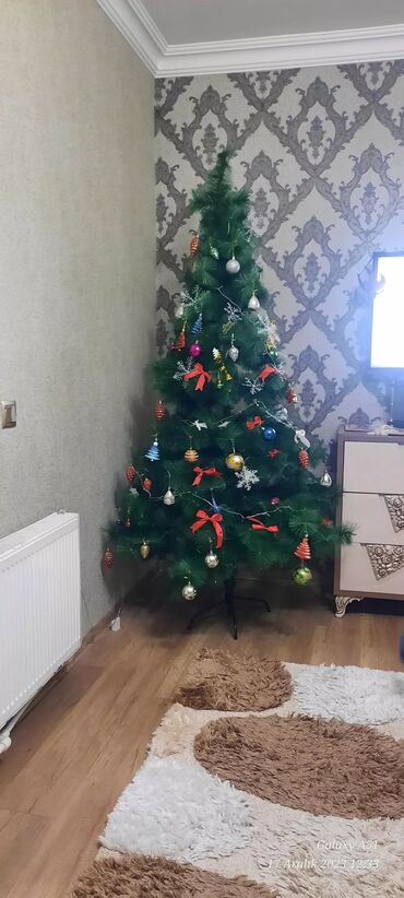 Şənlik mühitini dərhal yaradan, tam bəzədilmiş süni Yeni il ağacı.