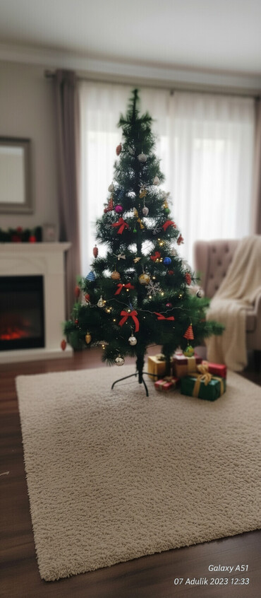 - Dekor: müxtəlif rəngli kürələr, qırmızı lentlər, qardanlıq fiqurları, şam qozaları, konus formalı oyuncaqlar, qarı xatırladan qar dənəcikləri və işıqlı qırıntılar görünür