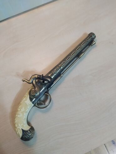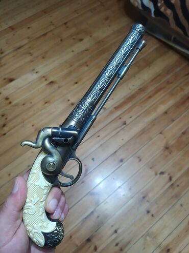Kolleksiyaçılar üçün dekorativ süvari tapançası (flintlokk üslubunda maket). Xüsusiyyətlər: - Material: ağac qəbzə, metal dekor və mexaniki hissələr - Uzun namlu, klassik flintlokk mexanizmi üslub...