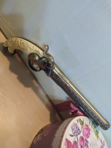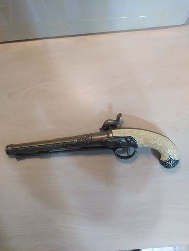 Dekorativ antik üslublu tapança maketi alışqan təkçə tətiyində problem var düzəltdirə bilər qədimdir - Material: ağac gövdə və metal (bürünc tonda) dekorativ hissələr - Namlu: genişlənən uclu, üz...