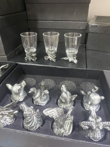 Heykəl başlı shot stəkanları dəsti – heyvan fiqurlu - Şüşə shot stəkanları, alt hissəsi metall heykəl başları ilə (maral, öküz, canavar, pələng, quş, kərtənkələ və s. müxtəlif heyvan motivləri). -...
