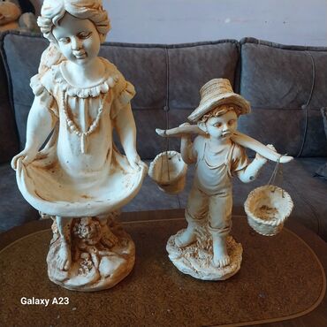 Dekorativ heykəl dəsti – 2 ədəd - Material: gips/daş qarışığı görünüşlü, antik krem rəng tonlarında - Dizayn: - Qız fiquru: əllərində geniş boşqab formalı ətək tutan klassik üslublu kompozisiya;...
