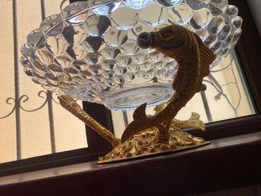 Şüşə ayaqlı qab – dekorativ meyvə və ya şirniyyat vazası - Material: qalın rəngli şüşə - Rənglər: dərin yaşıl gövdə, üst hissədə qızılı zolaq - Dizayn: əl işi kimi görünən relyefli ağ çiçək və qız...