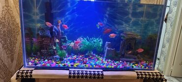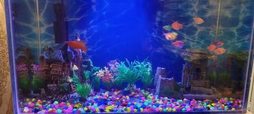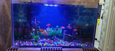 - Dekorasiya: rəngli çınqıl daşlar (neon effektli), süni bitkilər, qaya-kompozisiya, qəsr və məbəd temalı dekor fiqurları.
