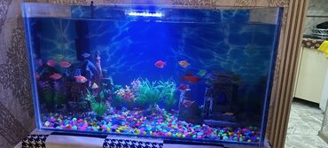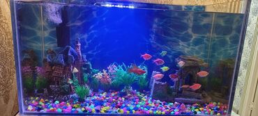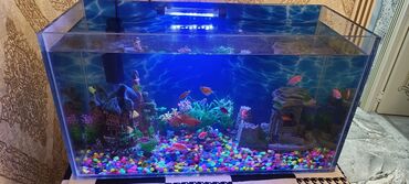 - Komplektdə görünənlər: akvarium korpusu, LED işıq, filtr/oksigen sistemi, dekor paketləri (qaya/abidə fiqurları, süni bitkilər), rəngli çınqıllar, bir neçə tropik balıq.