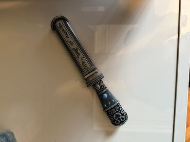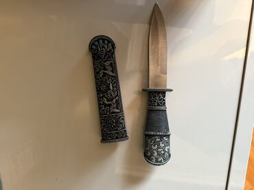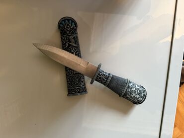 Qafqaz üslubunda bəzəkli xanjar (qınlı) - Bıçaq tipi: ikitərəfli itilənmiş xanjar - Üslub: Qafqaz/Şərq ornamentləri ilə bəzədilmiş - Material: - Bıçaq: parlaq cilalanmış metal, iki uzun eninə ka...