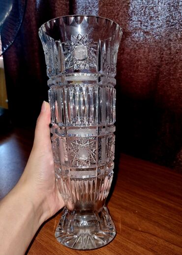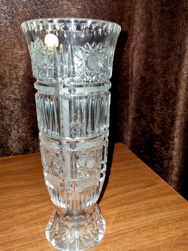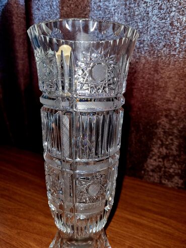 Çex kristal vaza - Material: çex kristalı - Hündürlük: 30 sm - Kəsim və naxışlı dizayn, qalın şüşə divarlar - Geniş ağızlı, dekorativ kənar forması - Mərkəz və dib hissəsi relyefli - Çiçəklər və y...