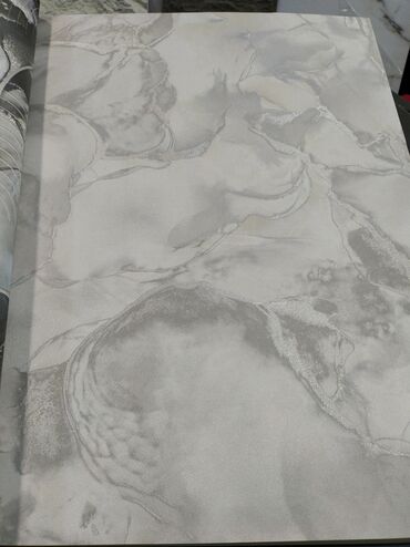 Mərmər effekti ilə dekorativ divar kağızı - Dizayn: Açıq boz/bej fon üzərində mərmər damarlarını xatırladan metalik gümüş və qızılı xəttlər, parıltılı tekstura. Böyük ölçülü naxış, məkanları vizua...