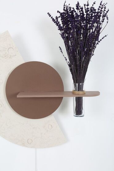 - Materiallar: Tekstural kompozit/ağ boya örtüklü əsas, MDF və ya ağac rəf və dairə, şüşə vaza.