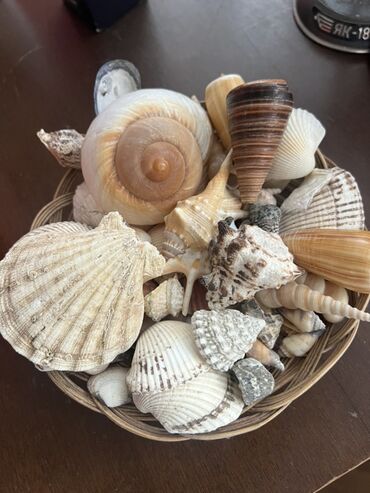 Dəniz kənarında təbii dekorativ dəniz qabıqları – sahildən toplanmış, müxtəlif ölçü və naxışlarda. Qum rəngli, krem–ağ çalarlarında, yumşaq xətlər və zolaqlar ilə. Ev dekoru, əl işləri, akvarium, m...