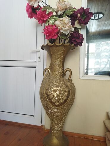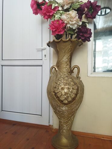 Ünvandan götürməDöşəmə üçün nəzərdə tutulmuş bu qızılı rəngli vaza istənilən məkana zəriflik qatır. Onun qıvrım kənarları və iki yan qulpu klassik görünüş verir. Vazanın ön tərəfindəki qabarıq naxışlar və parıldayan lent detalı estetik dəyərini artırır. Otaq künclərində, dəhlizlərdə və ya giriş hissələrində interyerə uyğun süni və ya təbii çiçəklərlə istifadə edilə bilər. Qızılı tonları müxtəlif rəng sxemləri ilə asanlıqla birləşir və otağın ümumi atmosferini zənginləşdirir. Bu vaza ev, ofis, otel və ya digər kommersiya məkanları üçün uyğun bir dekorativ elementdir. Üstündəki güllərlə beraber satılır bir balaca cati var