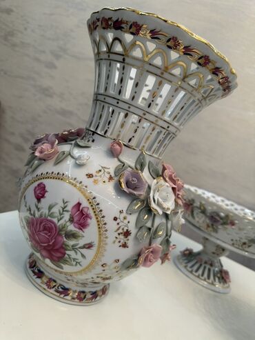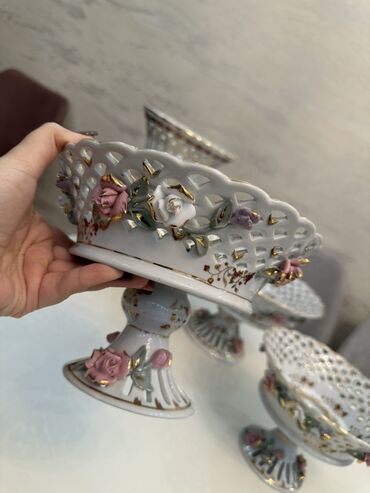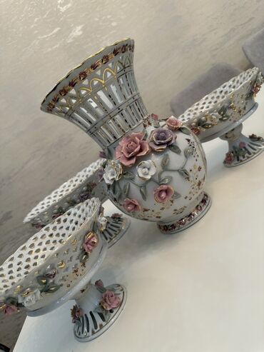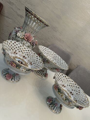 AğBu dəstə zərif ağ rəngli farfor vaza və bir neçə zərli, oymalı qab daxildir. Hər bir element gül naxışları və qızılı detallarla bəzədilib, bu da onlara xüsusi gözəllik verir. Qablar üzərindəki incə perforasiya və çiçək motivləri, həmçinin vaza üzərindəki qabarıq güllər dəstin estetik dəyərini artırır. Vaza hündür, yuxarı hissəsi genişlənən və oymalı quruluşa malikdir, qablar isə dayaqlar üzərindədir və mərkəzində portret təsvirləri ilə bəzədilib. Bu dəst ev dekorasiyası üçün uyğundur. 2 balaca 1 böyük meyvə qabı və güldandan ibarətdir
