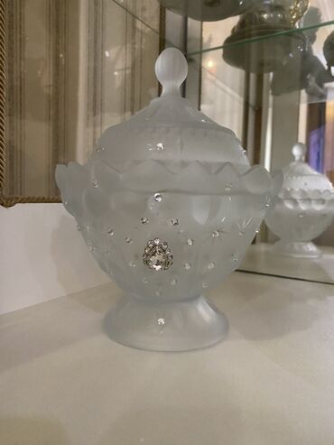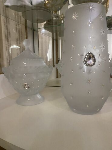 Başqa rəngDonanımlı qapaqlı iki qab və hündür vaza daxil olmaqla, buzlu şüşədən hazırlanmış bəzək dəsti. Hər bir əşya parıldayan bəzək daşları ilə bəzədilib, bu da onlara zərif və dəbdəbəli görünüş verir. Hündür vaza həm təzə, həm də süni çiçəklər üçün uygundur, qapaqlı qablar isə şirniyyat, zərgərlik və ya digər kiçik əşyaları saxlamaq üçün istifadə edilə bilər. Bu dəst istənilən daxili məkana gözəllik və zəriflik qatır, həm praktiki, həm də estetik cəhətdən əla seçimdir.