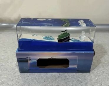 - Şəffaf akril korpuslu kiçik masaüstü dekor. İç hissədə mavi maye “dəniz” və üzən gəmi fiquru var; kənarlarda buzdağı detallarına bənzər elementlər yerləşdirilib.