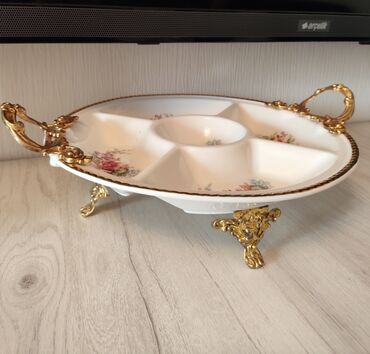 Porselen serviq qabı – klassik gül naxışlı, qızılı detallarla - Material: nazik porselen - Dizayn: mərkəzdə iri qızılgül kompozisiyası, kənarlarda çiçək haşiyələri - Kənarları və tutacaqları: baro...