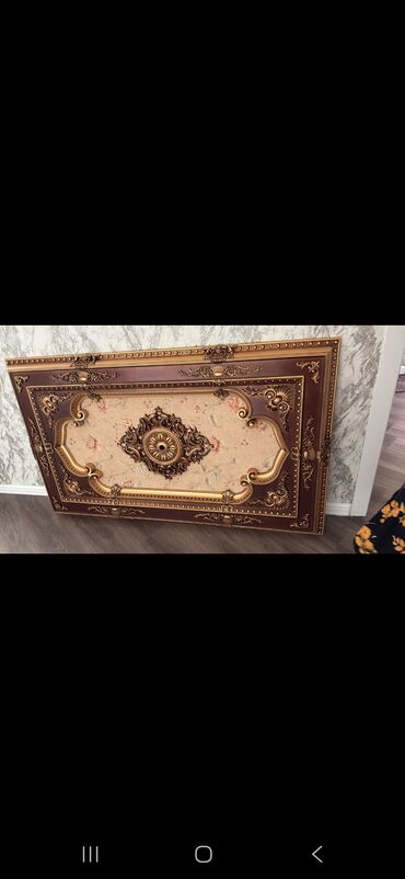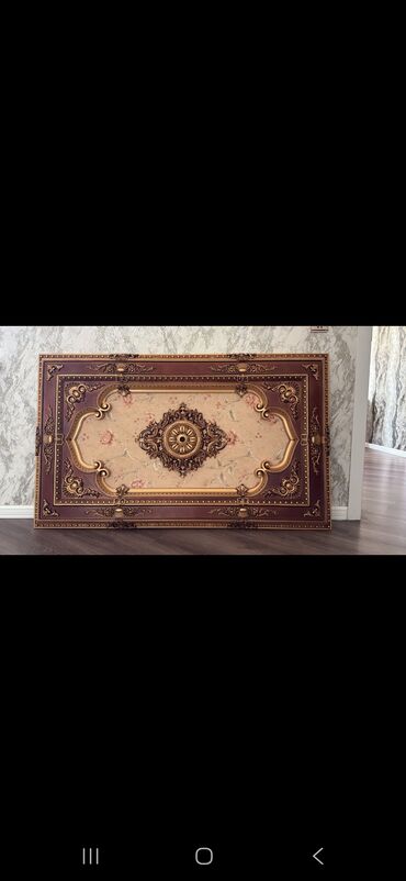 - Klassik dekor panel/başlıq: Böyük ölçülü, zəngin relyefli ornamentlər, qızılı və tünd qəhvəyi tonlarda işləmə. Ortada medalyon motivi, kənarlarda barokko üslublu naxışlar. Divar dekoru, başlıq və ya vitrin arxası üçün istifadə oluna bilər.
