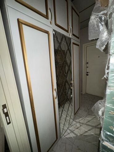 Şüşəli güzgü panel həm məkanı vizual olaraq genişləndirir, həm də geyim-yığışdırma zamanı rahatlıq yaradır. Qızılı haşiyələr və tutacaqlar mebelə zərif akcent verir.
