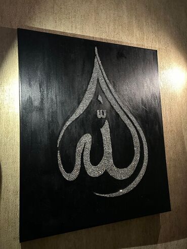 - Təsvir: Qara fon üzərində parlaq daşlarla işlənmiş “Allah” yazısı. Yazı konturları xırda, işığı gözəl əks etdirən daşlarla sıx şəkildə bəzədilib, dərinlik və parıltı effekti yaradır.