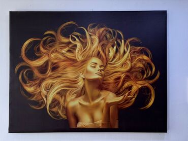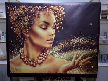 Böyük formatlı dekorativ divar paneli – qızılı detallı portret dizaynı - Material: Parlaq şüşə/akril səth (glossy), metalik qızılı çərçivə xətti - Dizayn: Qara fon üzərində qızılı aksessuarlarla v...