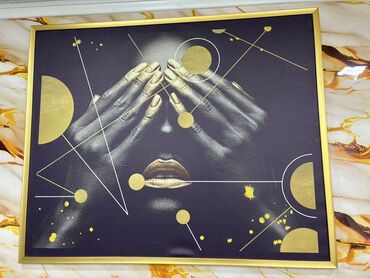 3) Abstrakt-figural tablo – qara fon üzərində qızılı həndəsi fiqurlar və qızılı dodaqlar, dekorativ çərçivə
