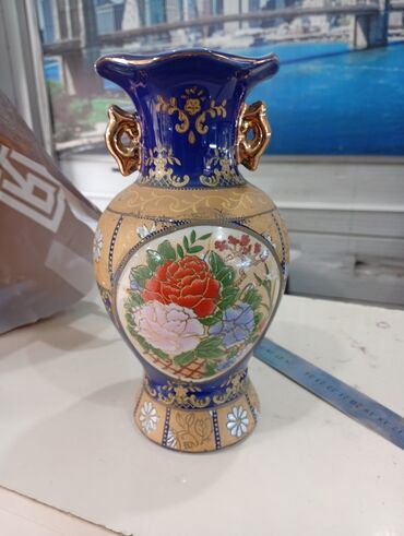 Dekorativ keramika vaza - Material: keramika/porşelen - Rəng: tünd kobalt-mavi fon, qızılı rellef naxışlar - Üzərində oval medalyonda əl işi üslubunda quş və çiçək təsviri (pion, yarpaqlar və s.) ...