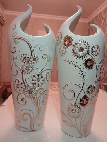 Böyük dekorativ vazalar dəsti - Material: qalın şüşə. - Dizayn: əl işi tətbiqlər və relyef bəzəklər; qızılı tonlu metallik örtük; ağ çiçək motivləri və incə ornamentlər; bəzilərində kobalt-mavi şü...