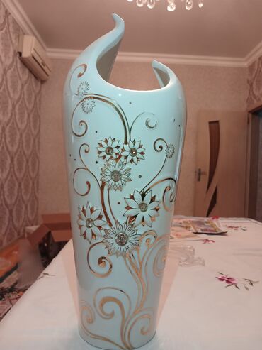 Zərif dekorativ vaza - Material: porselen/keramika - Rənglər: ağ əsas, parlaq qızılı naxışlar - Bəzək: əllə işlənmiş çiçək motivləri (yaşıl yarpaqlar, ağ-göy çiçəklər), relief qızılı ornamentlər v...