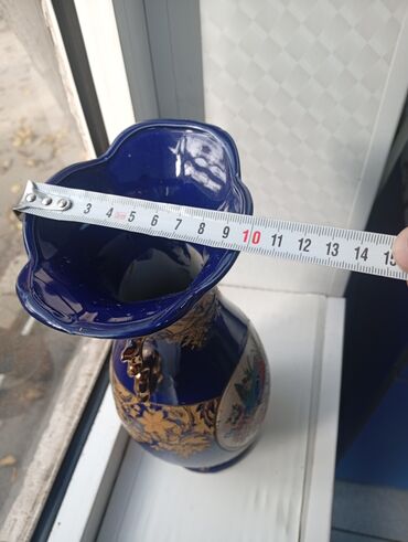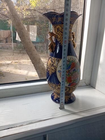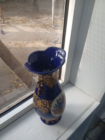 Məhsul: Bədii dekorativ iri vaz Təsvir: - Klassik üslubda, iri ölçülü dekorativ vaza. - Tünd göy (lacivərd) fon üzərində zəngin qızılı ornamentlər və relyef naxışlar. - Ön və arxa hissədə oval çər...
