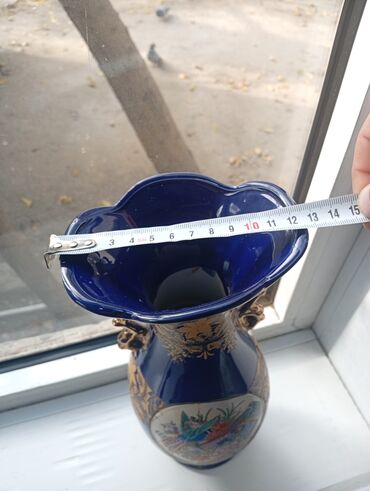 Kobalt-mavi şüşədən dekorativ vaza - Material: qalın şüşə, parlaq kobalt-mavi rəng - Üslub: oriental/çiçək motivləri - Bəzək: əl işi görünüşlü rəngli naxışlar – tovuz quşu, çiçək və yarpaq kompozi...
