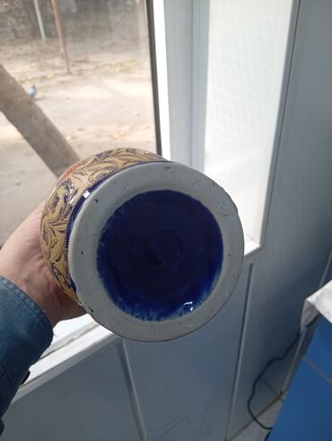 Mavi şüşə vaza – dekorativ - Material: qalın şüşə - Rəng: dərin kobalt mavi - Bəzək: qızılı rəngdə əl naxışları – güllü və naxışlı ornamentlər - Forma: yuxarı hissəsi yüngül daralan, geniş boğazlı...