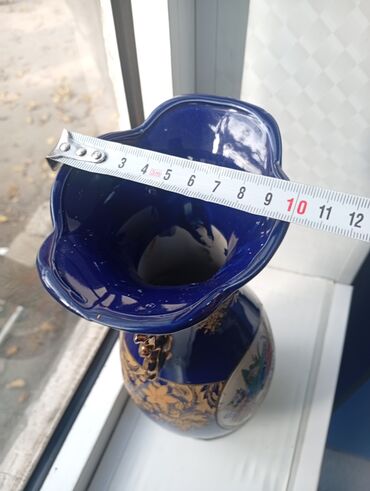Zərif dekorativ vaza - Material: keramika/porcelan görünüşlü. - Rəng: tünd göy (lacivərd) fon üzərində qızılı naxışlar və haşiyələr. - Dizayn: Gövdədə relyefli qəfəsvari naxış, boyun və ətək hissə...