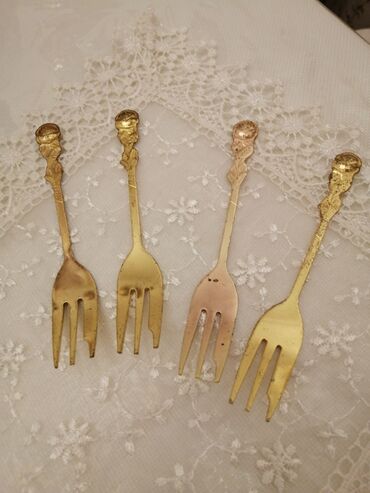 - 4 ədəd kiçik desert/ziyafət çəngəli: hərəsinin sapında relyefli bədii ornament və başlıq hissəsi var, iki dişli formaya yaxın, qızılı tonlarda.