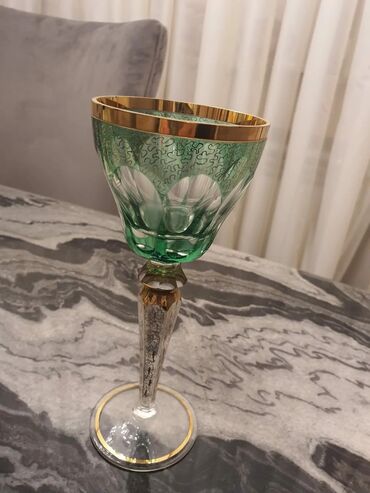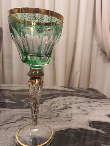 Yaşıl şərab qədəhləri dəsti – 2 fərqli üslub, hərəsindən 6 ədəd. - Dəst 1: Zümrüd-yaşıl bəzəkli kristal qədəhlər. Şəffaf kasanın ortasında mat-yaşıl zolaq, əllə çəkilmiş çiçək naxışı və qızılı haş...