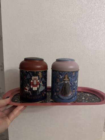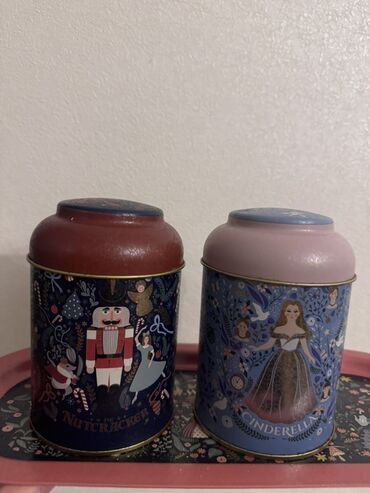 - 2 ədəd metal qutu: “The Nutcracker” və “Cinderella” mövzulu, rəngli illüstrasiyalarla. Qapaqlı, silindrik forma, kənarları qızılı haşiyəlidir. Çay, qəhvə, şəkər, ədviyyat və ya xırda aksesuarların saxlanması üçün uyğundur.