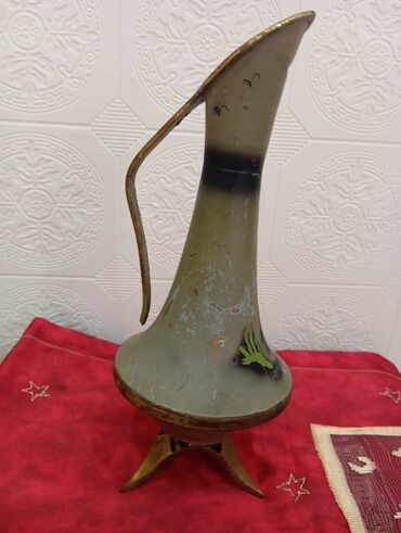 Metaldan dekorativ vaza - Material: tökmə metal (mümkünən bürünc/pirinç effektli). - Forma: dar boğazlı, geniş ağızlı, hündür ayaqlı siluet. - Rəng və işləmə: antik tonlarda yaşıl-qızılı patina, ü...