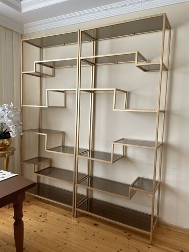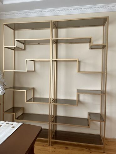 - Materiallar: metal çərçivə, tünd şüşə (smoke) rəf panelləri