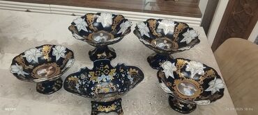 Qara-mavi fonlu, qızılı və ağ relyef naxışlarla bəzədilmiş dekorativ meyvəqabı dəsti.