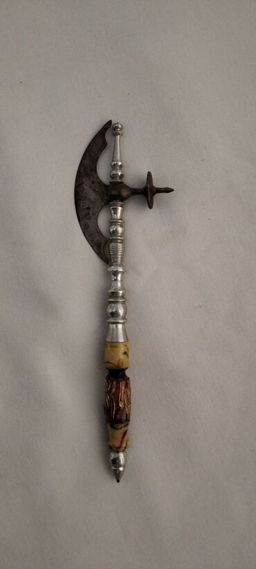 - Dizayn: Qədim üslubda mini balta formasında dekorativ başlığa malik qələm. Yarımay şəkilli metal bıçaq, qarşı tərəfdə sivri çıxıntı və üst hissədə fiqurlu sütun detallar.