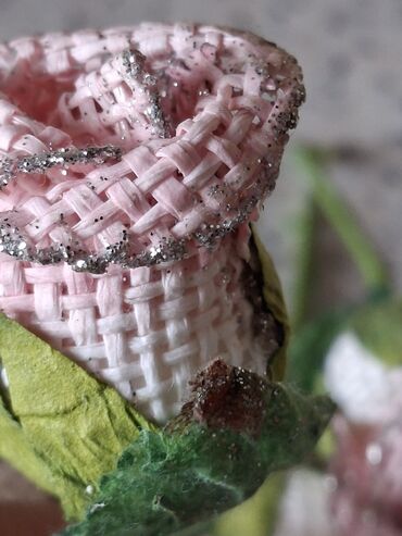 - Material: toxuma quruluşlu kağız/parça (çörəkotu tipli hörgü fakturası), yaşıl kağız yarpaqlar, nazik tel əsaslı saplaqlar