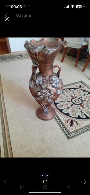 Əl işi dekorativ vaza hündürlüyü 36 sm,diametri 13 sm - Material: keramika - Rəng palitrası: tünd qara-qəhvəyi əsas, qızılı relyef naxışlar - Dizayn: iki yan tutacaqlı, klassik amfora forması - Ö...Giriş•Qeydiyyat