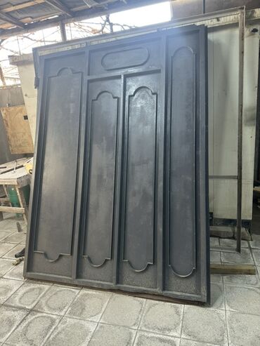 Metall qapı - Material: qalın metal/sac konstruksiya - Dizayn: üst hissədə şəbəkəli pəncərə bölməsi, mərkəzdə relyefli panelli dekor; dalğavari xəttli üst panel - Rəng: boz (metalın təbii tonu) - ...