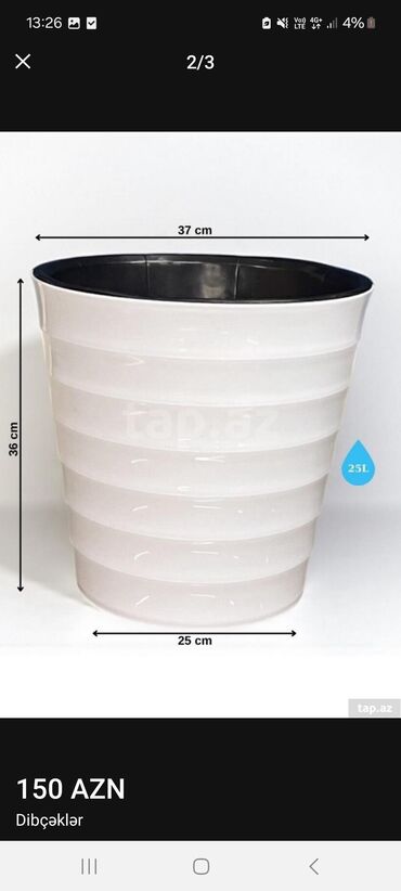 - Geniş ağızlı model: hündürlük 36 sm, yuxarı diametr 37 sm, aşağı diametr 25 sm, tutumu 25 litr.