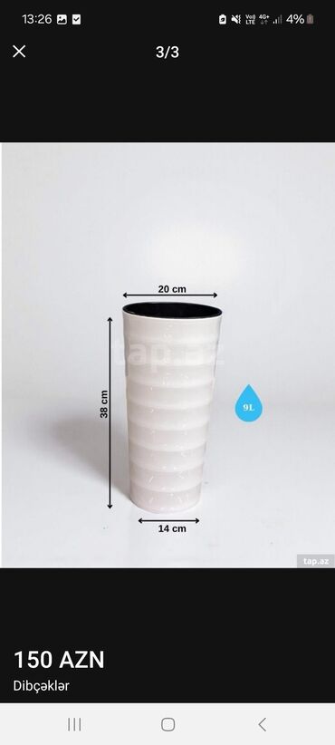 - Silindrik model: hündürlük 38 sm, yuxarı diametr 20 sm, aşağı diametr 14 sm, tutumu 9 litr.